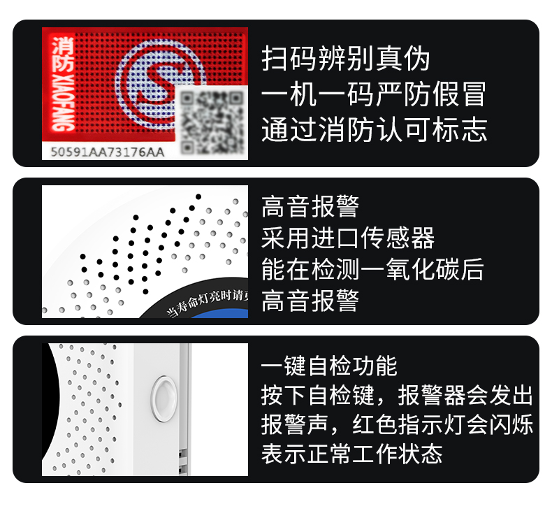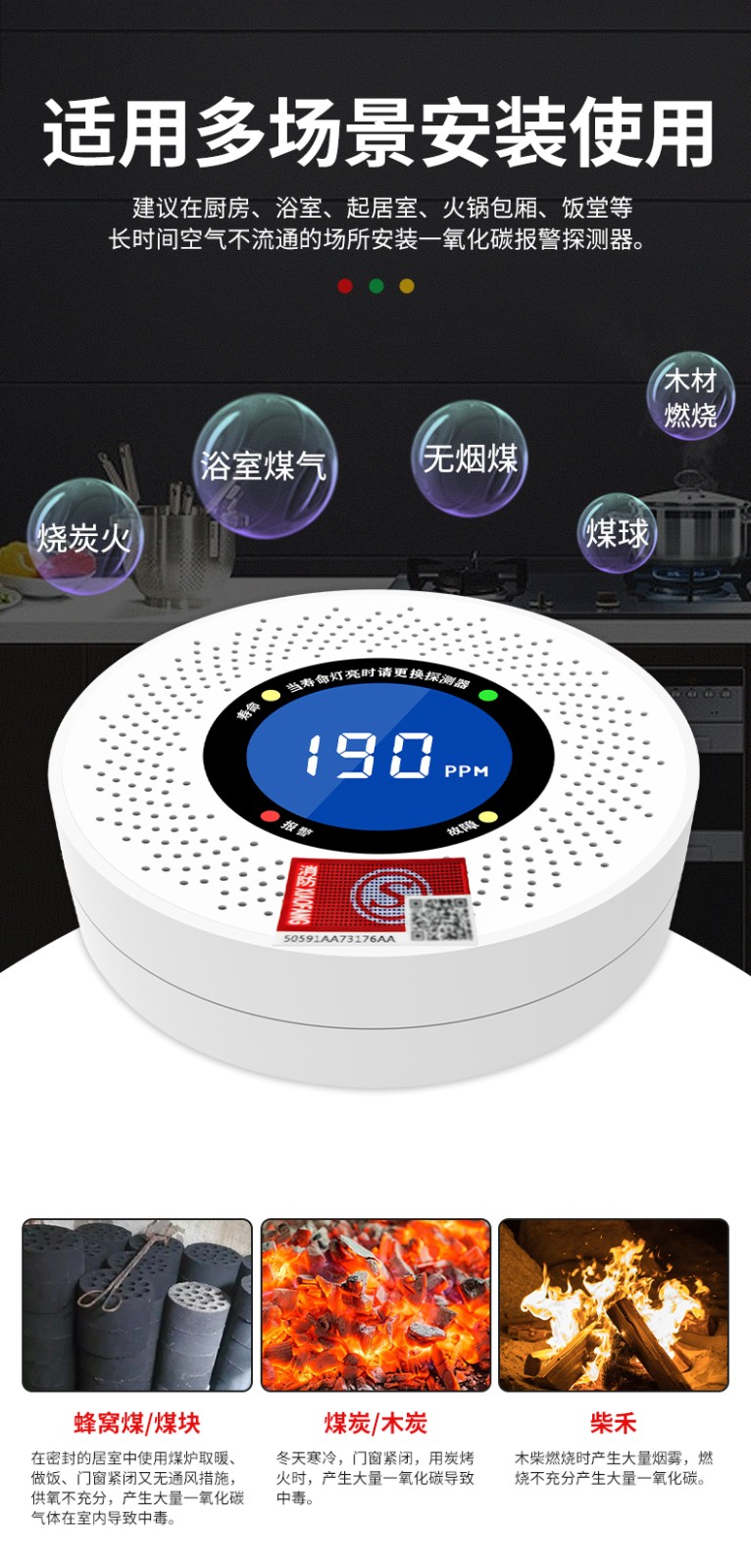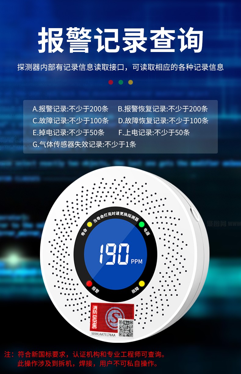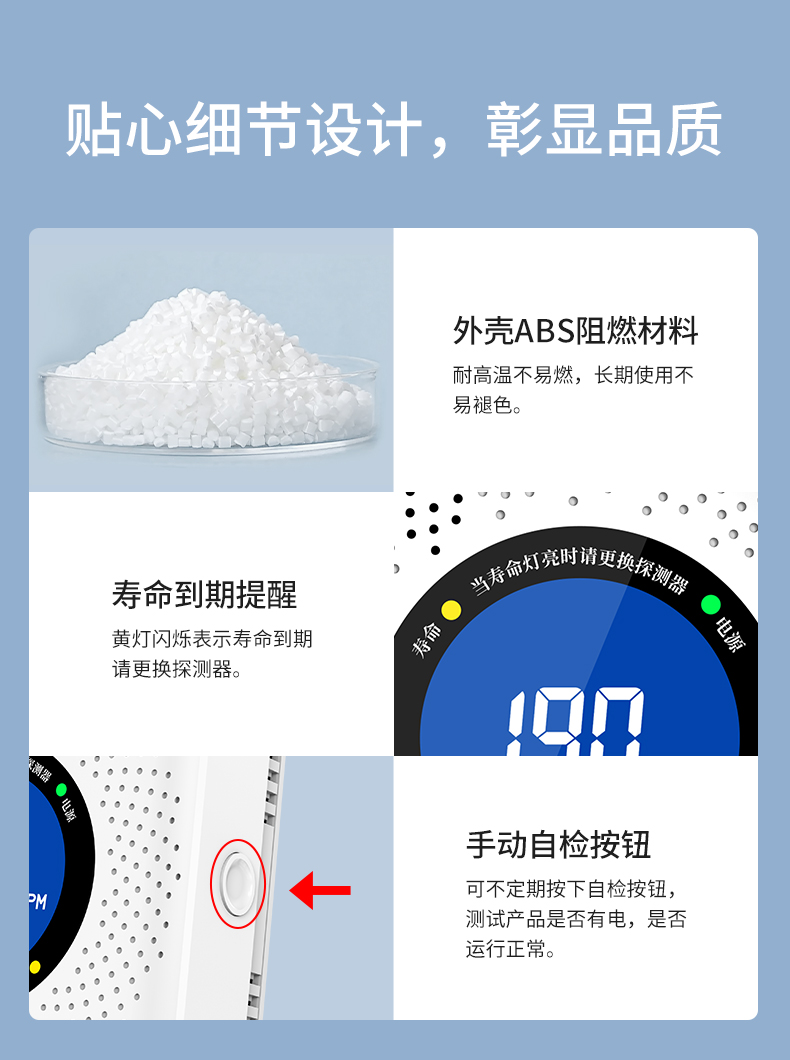 一氧化碳報警器(型號PA-007) 產(chǎn)品規(guī)格 功能特點 資料下載 一氧化碳報警器(型號PA-007)1.探測氣體:一氧化碳2.報警方式:高音報警、聲光報警3.材質(zhì):ABS阻燃材質(zhì)4.產(chǎn)品保險:1000萬承險適用場景:適用于廚房、浴室、起居室、火鍋包廂、飯?zhí)玫乳L時間空氣不流通的場所安裝一氧化碳報警探測器