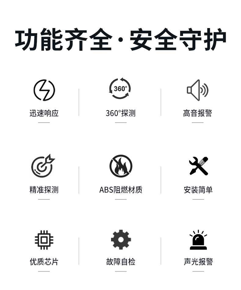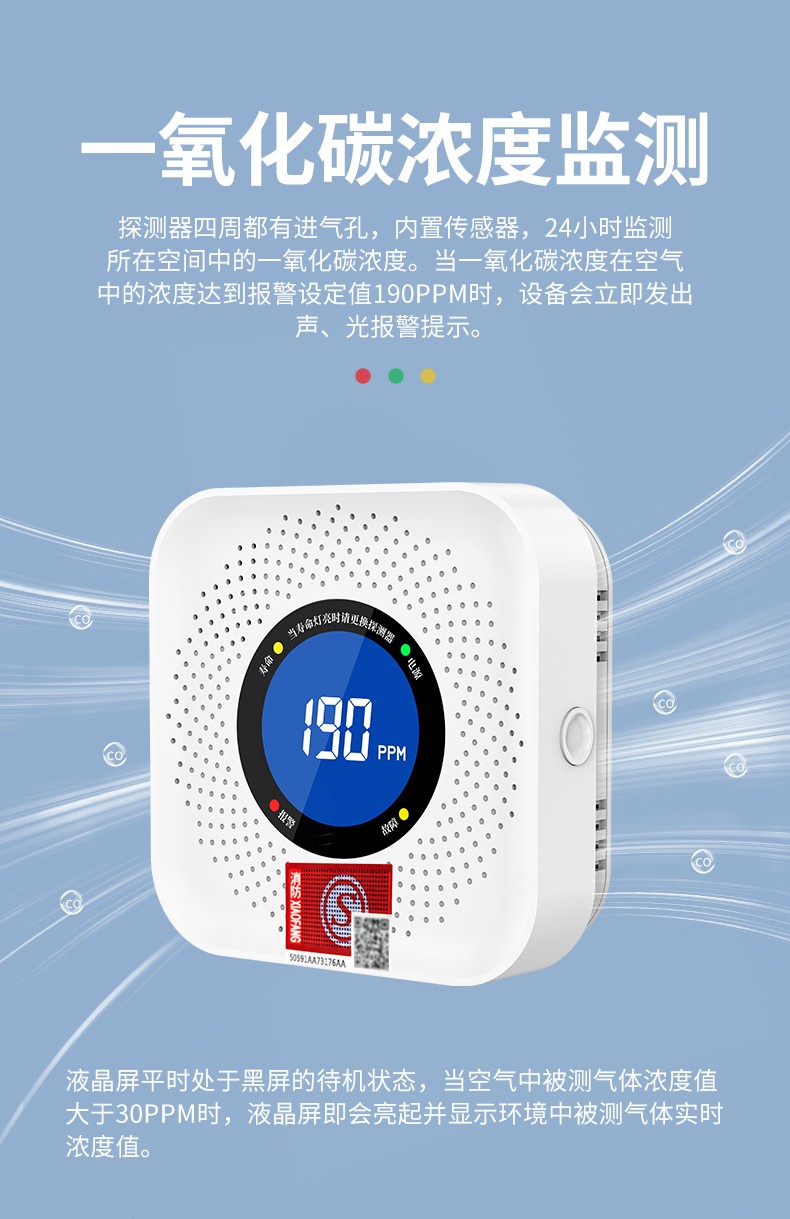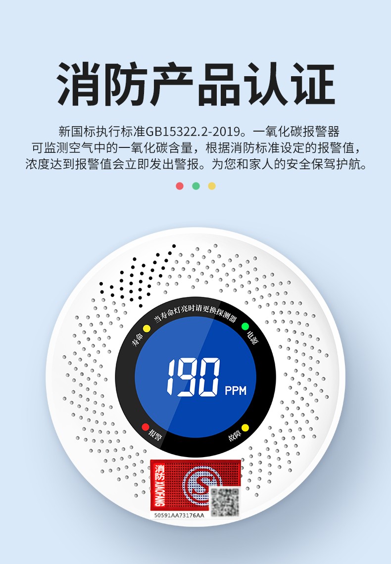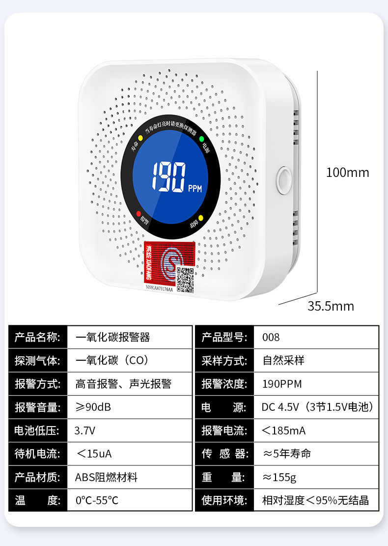 一氧化碳報警器(型號PA-008) 產(chǎn)品規(guī)格 功能特點 資料下載 一氧化碳報警器(型號PA-008)檢測氣體、燒煤、燒柴、燒炭、蜂窩媒、露營封閉環(huán)境、封閉車內85分貝報警音量.LED液晶屏幕顯示故障自檢: 綠燈(正常)、黃燈 (故障、需要檢修) 紅燈(氣體濃度超標) 5.報警方式:蜂鳴聲提示 6. 產(chǎn)品保險:1000萬承險 7. ABS阻燃材質適用場景:適用于廚房、浴室、起居室、火鍋包廂、飯?zhí)玫乳L時間空氣不流通的場所安裝一氧化碳報警探測器