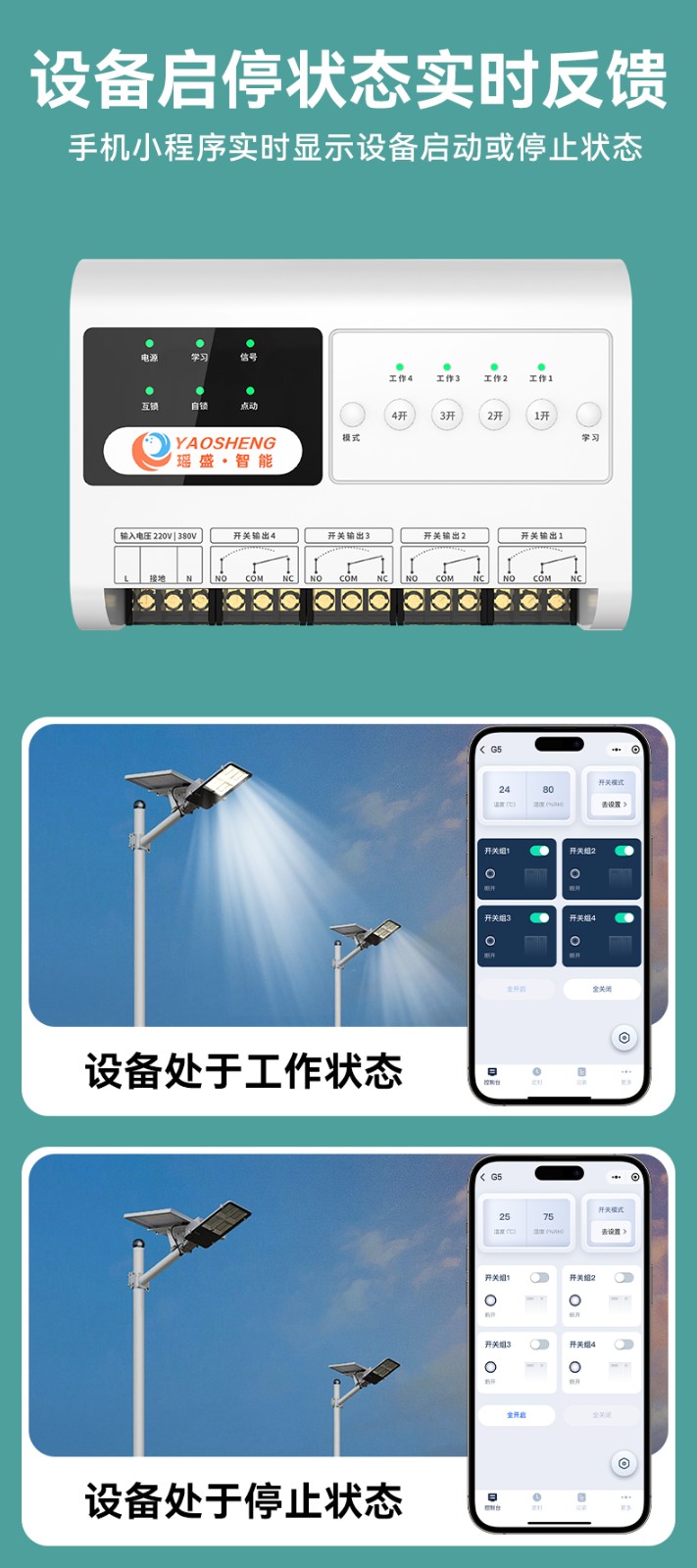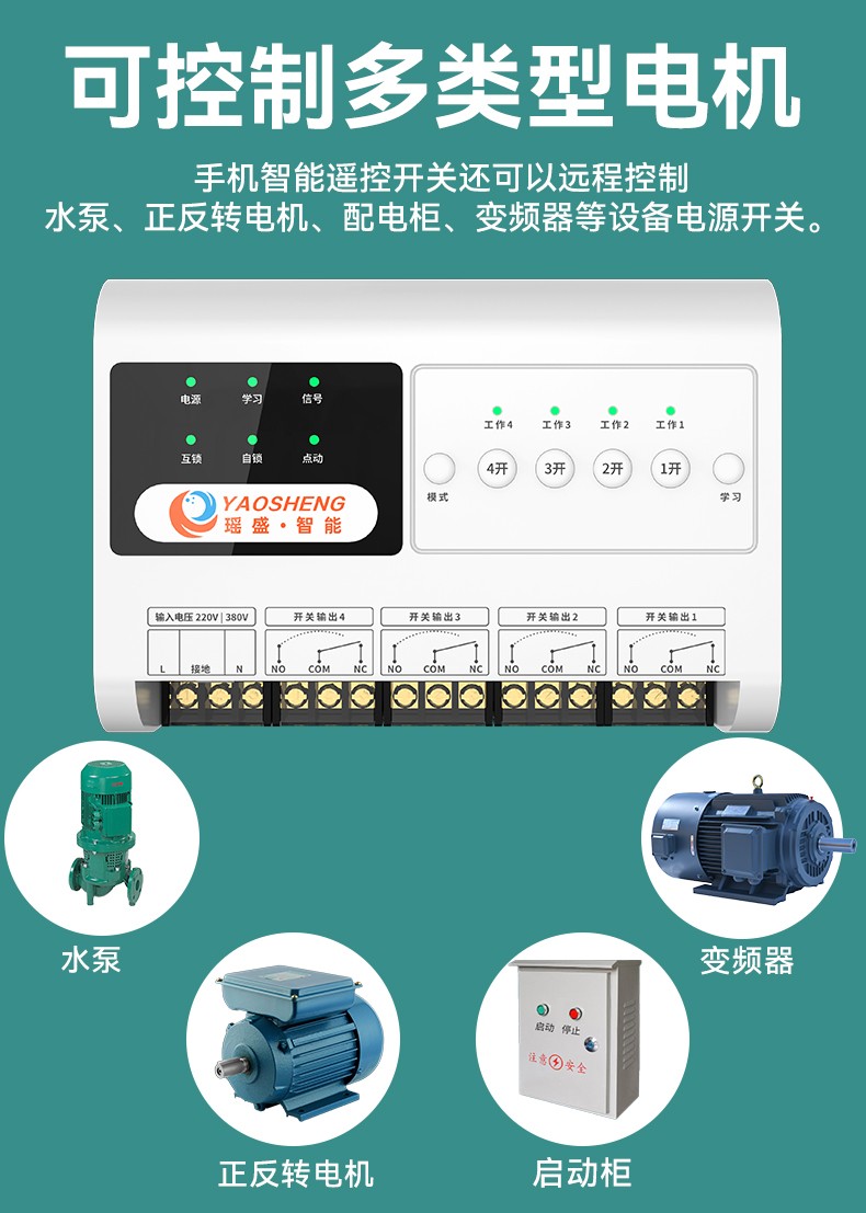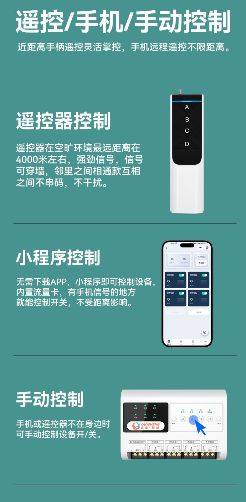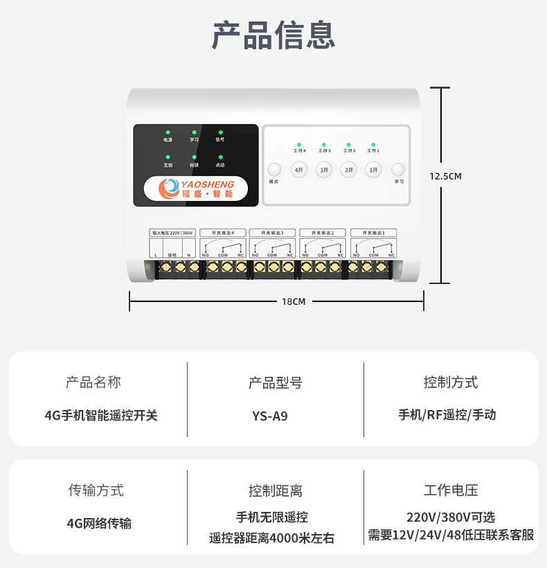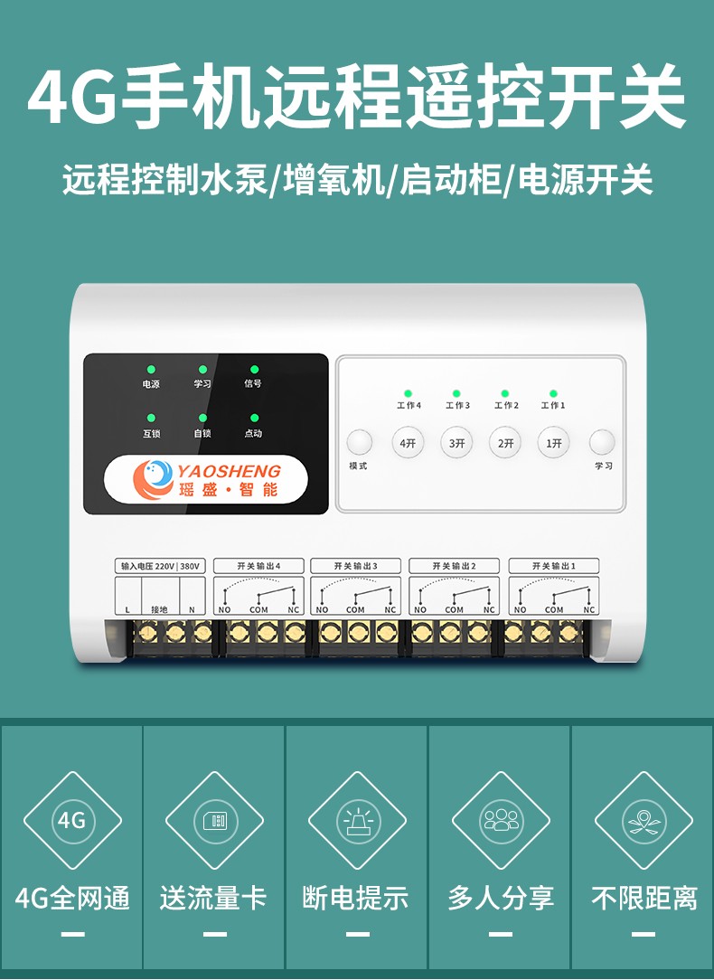 4G 遠程控制開關(guān)(YS-A9) 產(chǎn)品規(guī)格 功能特點 資料下載 4G 遠程控制開關(guān)(YS-A9)1.無需wifi 2.無線距離全國使用3.斷電報警 4.本地定時 、云端定時 、倒計時6.工作模式切換 :點動模式、互鎖模式、 自鎖模式7.多人管理控制 8.設備工作狀態(tài)檢測9.設備啟動反饋10.溫度實時檢測11.可自定義命名控制方式:遙控器控制 、手機小程序控制 、手動控制工作電壓:220v/380v 應用場景:農(nóng)業(yè)灌溉/魚塘增氧/電工維修/工控設備/各類電機/ 溫室花盆